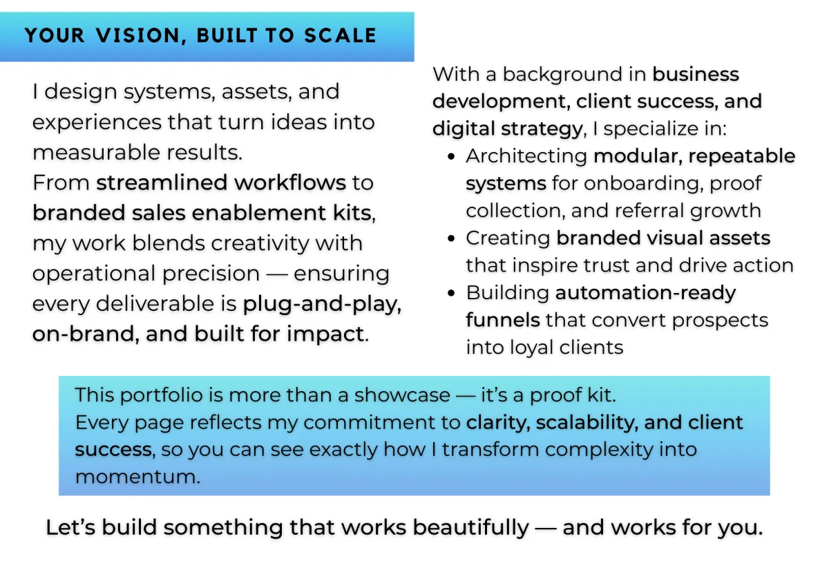 Whether it’s streamlining your operations, elevating your brand presence, or creating proof-driven assets that close deals, my role is to make your vision tangible — and scalable.